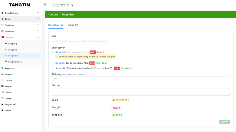 Tangtim.com là địa chỉ tin cậy hàng đầu hiện nay cung cấp dịch vụ buff view YouTube an toàn, giá rẻ. Chúng tôi có nhiều gói dịch vụ phù hợp với từng mục tiêu của bạn – từ tăng view đơn thuần, đến tăng sub, tăng tương tác toàn diện cho kênh.
